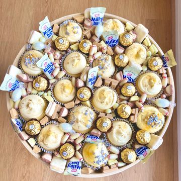 Homemade butter cake cupcakes with vanilla butter cream icing, an assortment of chocolates and lollies to match your theme!